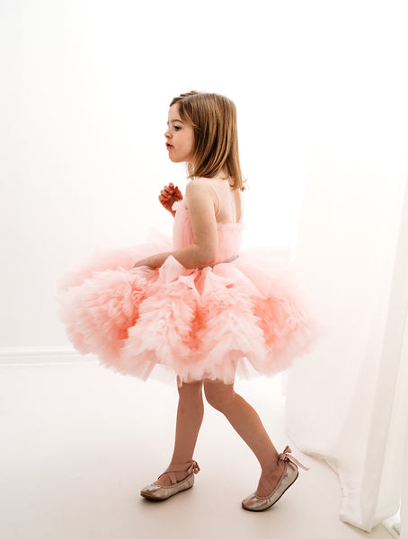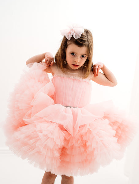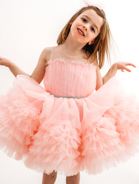 Éthéré dress is made with a fluffy skirt that gives the feeling of a princess, the embroidered rhinestones at the waist emphasize her sophistication and the mesh on the shoulders completes this look