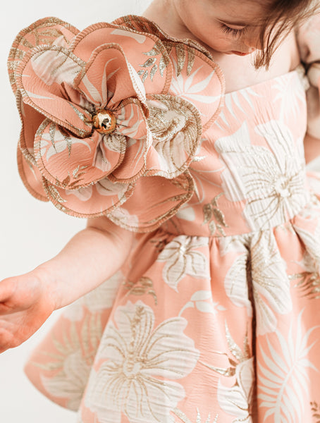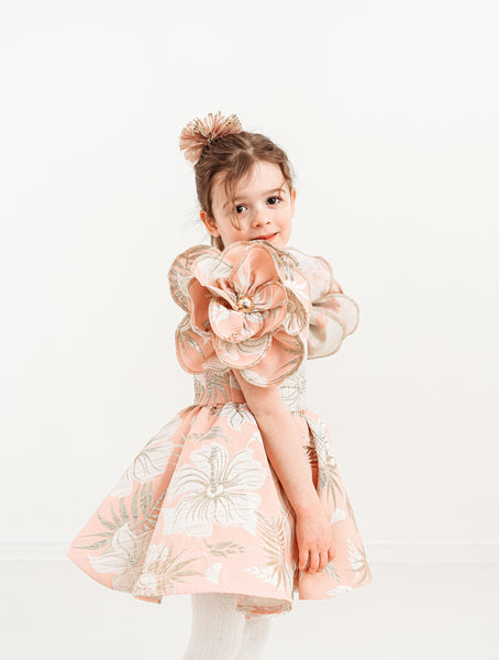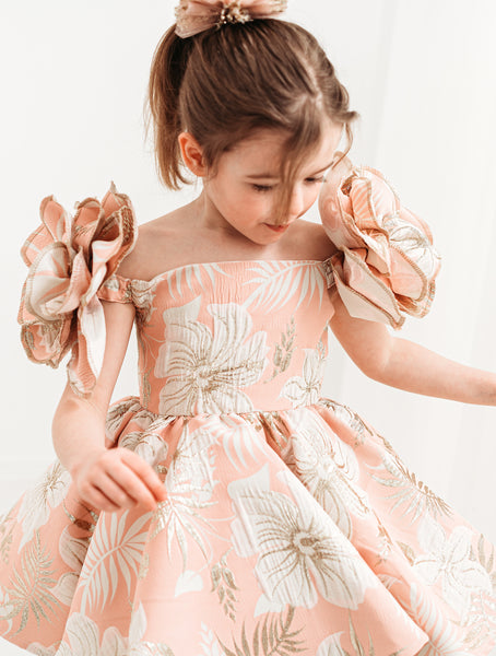Oh la la! Lafleur dress is made of jacquard, off shoulder design emphasize all the beauty and flowers on the shoulders are the main detail of this dress.