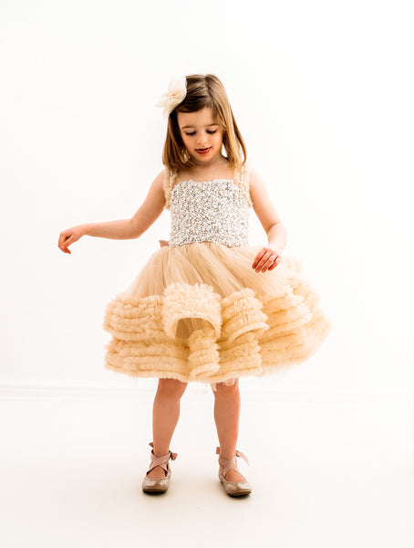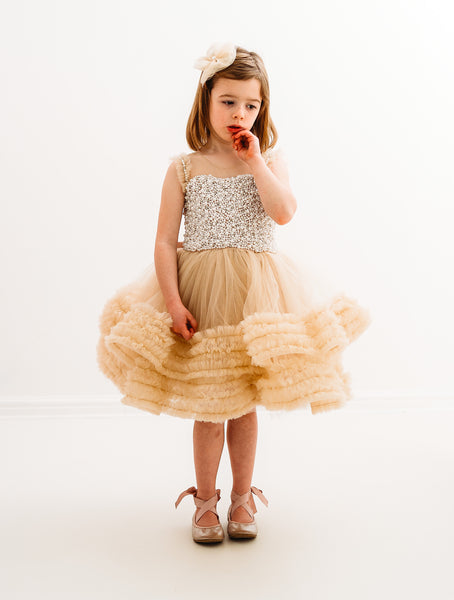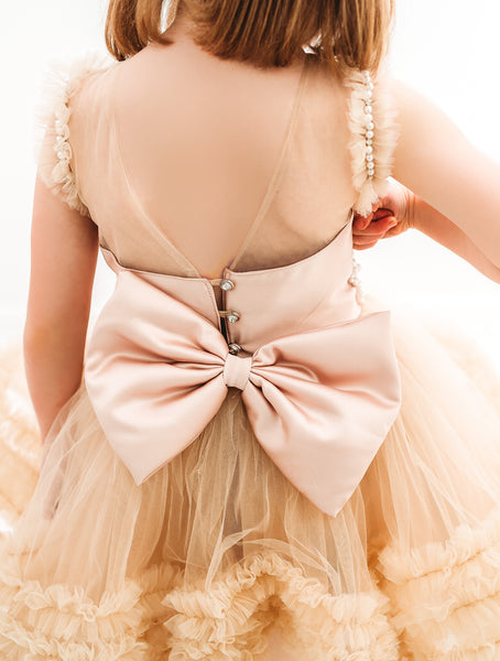 Pétillante dress is made in cream color with embroidered beads and rhinestones, the mesh on the shoulders creates a sophisticated look and a silk bow will accent this dress